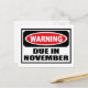 Avertissement DUE IN NOVEMBER Postcard vous pouvez customiser à www.WarningSignShirts.com et comporte un panneau rouge et noir d'avertissement et DUE IN NOVEMBER en lettres noires en gras pour avertir le monde. Vous pouvez également customiser votre propre panneau d'avertissement Carte postale avec le texte que vous voulez.