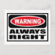 Attention TOUJOURS bonne carte postale vous pouvez customiser à www.WarningSignShirts.com et comporte un panneau rouge et noir d'avertissement et TOUJOURS DROIT en lettres noires en gras pour avertir le monde. Vous pouvez également customiser votre propre panneau d'avertissement Carte postale avec le texte que vous voulez.