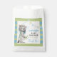 These super cute baby shower favour bags have a striped pattern in green and blue with a light grey text box trimmed in yellow. On the left side, there is a grey wolf holding a green airplane and a big blue balloon. The wolf has a green and blue striped scarf and a blue vintage-type aviator's hat with brown eye goggles. There are also some corner bunting flags in the upper right corner in green, blue, and yellow patterns. The customizable text says, "Ashleigh's Baby Shower" on it in blue and grey lettering with the date also printed in green below and a large "Thank You!" in blue cursive at the bottom. If you require assistance or would like any other matching items, please email your request to niteowlstudio@gmail.com and watch your spam folder for my reply. Thank you!