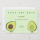 A wedding Save the Date card with an avocado theme. This announcement card lets the two of you be represented by happy avocados, getting ready to start their lives together. The colour scheme is in shades of green and the design has a mix of whimsy and modern.