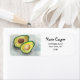 Watercolor painting of a fresh green avocado sliced in half. Grayish and blue mottled background.