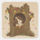 A cute illustration of a beagle in a hollow tree covered in colorful leaves