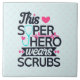 A ceramic tile with a cute and awesome saying. Typography text says: This superhero wears scrubs. Designed with a light blue stethescope and a big pink heart and a pink heart monitor line. A light blue background with faded pink polka dots.