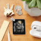 A fierce looking dark gray and black pussy cat wearing a leather hat with steampunk brass on it. A bronze feather tops the cock-eyed hat. This beautiful feline is wearing a golden or amber lensed monocle giving one eye a bronze tone, Around the cats neck hangs a brass trinket of some kind adding to the overall Steampunk attire.