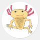 A hand drawn colorful axolotl facing the viewer. Bright red purple fronded gills, blue eyes, yellow body - caught in mid swim attempt. A fun image for axolotl fans and indeed - fans of axolotls.