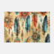 Aztec boho native American watercolor tribal design of turquoise blue feathers, abstract red sunflowers and geometric shapes on a desert sand background.