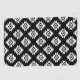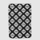 Aztec influenced stylized symbol in a repeat surface pattern design in black and white detail on a black background.