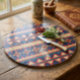 Bring colour and culture into your kitchen with this *Aztec Elegance* glass cutting board. Designed with bold red, blue, and tan tribal patterns, this tempered glass piece doubles as functional prep space and eye-catching décor. Add a touch of Southwestern charm to your countertop!