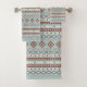 Aztec a influencé le motif à motifs mélangés dans les couleurs rouilles et un détail couleur crème sur un arrière - plan bleu. Répétez le motif à la main et la serviette de bain.