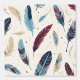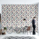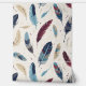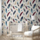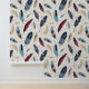 This beautiful, rustic wallpaper has an Aztec style Native American feather pattern in various shades of tan, dark cranberry and blue against a white background.