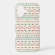 Aztec influenced shapes and line pattern in rust/terracotta color teal color detail on a cream color background.