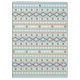 Aztec influenced shapes and line pattern in rust/terracotta colours and a cream colour detail on a teal-blue background.