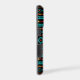 Aztec influenced and stylized mixed motifs pattern in teal, red, dark red and yellow on black.