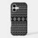 Aztec mixed motifs pattern in black, white and grey detail on a black background monochrome design.