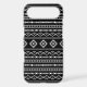 Aztec mixed motifs pattern in black, white and grey detail on a black background monochrome design.
