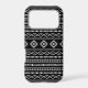 Aztec mixed motifs pattern in black, white and grey detail on a black background monochrome design.