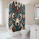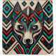 This is a decorative wolf face made by hand and stylized with Aztec patterns in black, red, turquoise and beige colours.