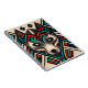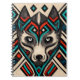 This is a decorative wolf face made by hand and stylized with Aztec patterns in black, red, turquoise and beige colours.