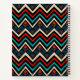 This is a decorative wolf face made by hand and stylized with Aztec patterns in black, red, turquoise and beige colours.