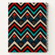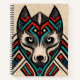 This is a decorative wolf face made by hand and stylized with Aztec patterns in black, red, turquoise and beige colours.