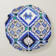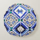 Azulejo Spanish Pattern Tiles Navy White Monogram Round Pillow
