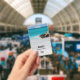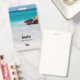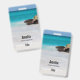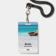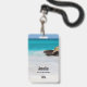 Name badge with a beautiful photograph. A white sandy beach, with a gentle surf. Tropical turquoise water surrounds a jagged rock.