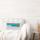 A pillow with a beautiful photograph. A white sandy beach, with a gentle surf. Tropical turquoise water surrounds a jagged rock.