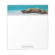 Notepad with a beautiful photograph. A white sandy beach, with a gentle surf. Tropical turquoise water surrounds a jagged rock.