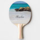 Personalized ping pong paddle with a beautiful photograph. A white sandy beach, with a gentle surf. Tropical turquoise water surrounds a jagged rock.