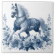 An azure steed, captured mid-stride, embodies floral grace on this ceramic tile. Intricate floral patterns, reminiscent of delicate blossoms, flow across the horse's body, flowing mane, and tail, extending to its decorative saddle or harness. The artist skilfully portrays the animal's powerful muscles and fluid movement. A border of detailed floral designs in the same deep blue hue frames the image. The balanced composition and a slightly elevated perspective emphasize the horse's dynamic posture. Muted colours and soft lighting create a serene, vintage atmosphere, evocative of classic tile craftsmanship. This meticulously rendered design radiates classic beauty and artistry.