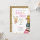 Babes and Bubbly Galentine's Day Party Invitation with Champagne bottle, champagne flutes, gold faux glitter and pink macaron.