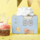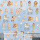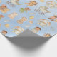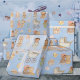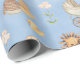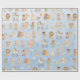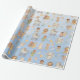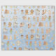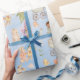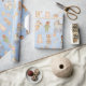 Baby wrapping paper featuring watercolor-painted international babies with animals, prams, bottles, rubber ducks, blocks and stuffed animals on a blue ombre background.