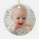 This adorable ceramic ornament features a cute teddy bear holding two heart-shaped pastel green balloons adorned with elegant greenery wreath. The back design gives you the option to add your baby's photo to make the ornament even more personal and special!