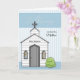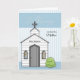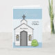 Custom name of baby boy for Baptism Congratulations in sweet baby blue hues with vertical stripes and a sweet illustration of a church or chapel.