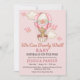 Cute illustration of a baby bear in a pink balloon with clouds and birds. The background is pale pink