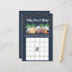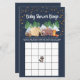 Sweet rustic baby bingo shower game featuring a cute watercolor illustration of woodland animals with their tent camping under a dark blue starry night sky in the mountains and forest and "Baby Shower Bingo" in a white script.