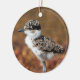 Ceramic decorative ornament with an image of a Blacksmith Lappedwing chickling standing near water.