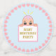 Baby birthday party table confetti framed with pink hearts. Confetti has yellow and light blue backgrounds. Text can be personalized.