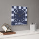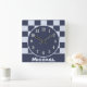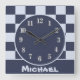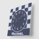 Do you know a little guy who has recently joined your circle of friends and family? This baby nursery wall clock features a square pattern quilt design in alternating dark and light blue colours and is personalized with the special little guy's name. A solid dark blue banner at the bottom displays the name which can quickly be personalized.