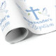 This elegant Baptism celebration gift wrapping paper features a soft, baby blue coloured cross. A beautiful white dove is placed on either side. A sample name is printed below the cross and doves, with the word "Baptism" printed beneath it. You can personalize the wrapping paper to include your own custom name or message. It makes a wonderful addition to the Baptism celebration for your baby boy.