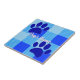 Cartoon dog paw prints in baby blue on blue plaid pattern background.