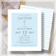 Celebrate your child's baptism with our beautiful baby blue baptism invitations! These invitations feature a clean white border and a baby blue background, with a stunning gold effect cross that adds a touch of elegance to your special occasion. The back of the invitation features a stripe baby blue and white design, giving it a charming and polished look. Our invitations are printed on affordable paper, making them an excellent choice for those who want to celebrate their child's baptism without breaking the bank. They are also easy to personalize, allowing you to add your own wording and details to make the invitation truly unique. Whether you're hosting a small gathering or a large celebration, our baby blue baptism invitations are perfect for inviting your friends and family to share in this special moment with you.