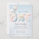 This adorable invitation features the word “ONE” illustrated with sweet bear faces and a whimsical hot air balloon, creating a magical and gentle vibe perfect for a little one’s big milestone. Set against a light sky blue background.