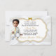 Beautiful baby boy in white & gold suit. Invitation background is white satin with a gold and silver glitter frame and bow embellishment. Back is adorned with gold flower pattern & gold ribbon on a white satin background.