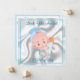 Cute Baby Boy Birth Announcement- satin look backdrop with baby blue lace border- cute cartoon baby boy with blue diaper and hat holding a blue baby bottle