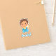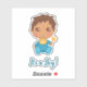Cute cartoon baby dressed in a blue jumpsuit with a yellow bib holding a baby rattle.