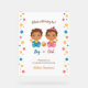 Bébés mignons, garçon et fille, en bleu et rose rompers et bibs jaunes tenant des hochets assortis. Le genre, joli et original, révèle l'invitation.
