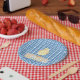 A baby chick with a blue gingham background boy's baby shower paper plates.