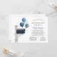 A baby shower by mail invitation is perfect for those that live a long distance from loved ones, but still want to shower the parents to be with love and gifts to prepare for the arrival of their baby. This long distance shower by mail invitation features a hand painted mailbox filled with blue balloons and the request poem "It’s difficult to live so far away When Baby Anderson is on the way. Gathering loved ones can be so hard So if you like, please mail your gift or card. And as they arrive day by day, They’ll feel all your love from far away." Customize with your wording. Click "Customize further" to edit the font style, size and colour if desired.