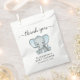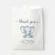 Cute thank you party favour bags for your baby boy shower with "thank you" written in a soft grey script with swashes and a pastel blue watercolor of a baby elephant. Personalize the mother-to-be's name and shower date in simple grey typography.